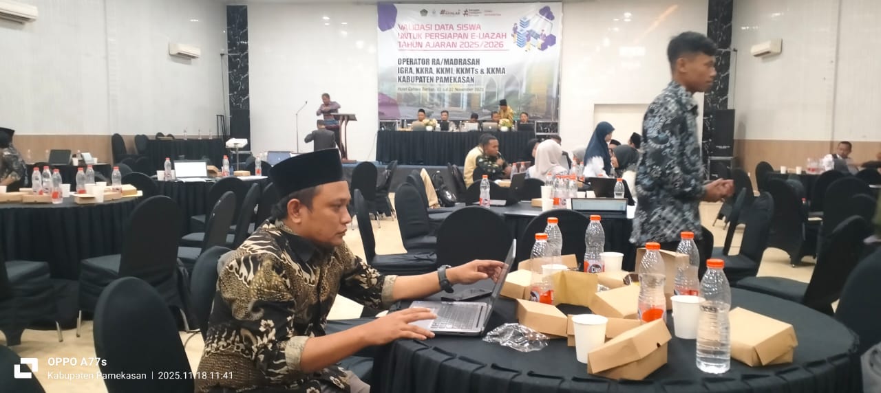 Pamekasan, 18 November 2025 — Operator MTs As-Salafiyah mengikuti kegiatan Pendampingan Validasi Data Siswa dalam rangka persiapan penerbitan E-Ijazah Tahun Ajaran 2025/2026 yang diselenggarakan oleh Kantor Kementerian Agama Kabupaten Pamekasan. Kegiatan ini bertempat di Hotel Cahaya Berlian Pamekasan dan diikuti oleh seluruh operator madrasah tingkat MTs se-Kabupaten Pamekasan.