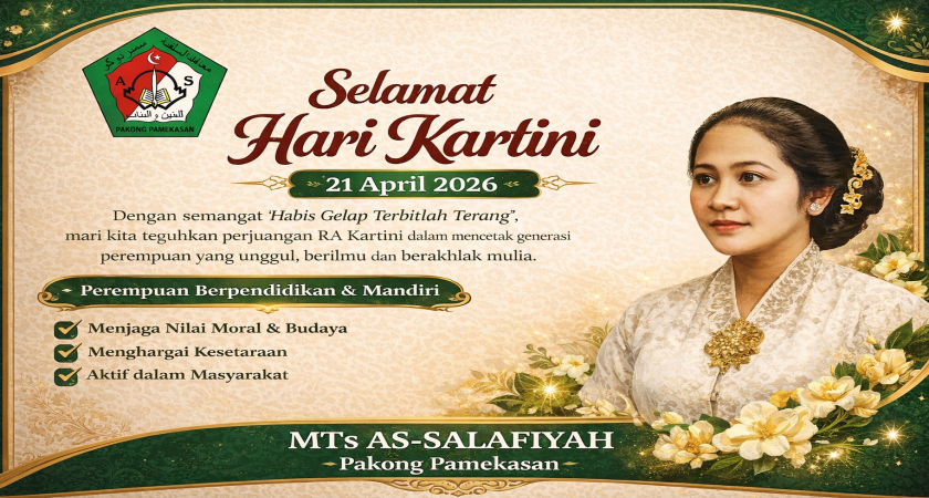 Pakong, 21 April 2026 – Dalam rangka memperingati Hari Kartini yang jatuh setiap tanggal 21 April, keluarga besar MTs As-Salafiyah menyampaikan ucapan selamat Hari Kartini kepada seluruh perempuan Indonesia, khususnya para siswi, guru, dan tenaga kependidikan perempuan yang terus berkontribusi dalam dunia pendidikan.